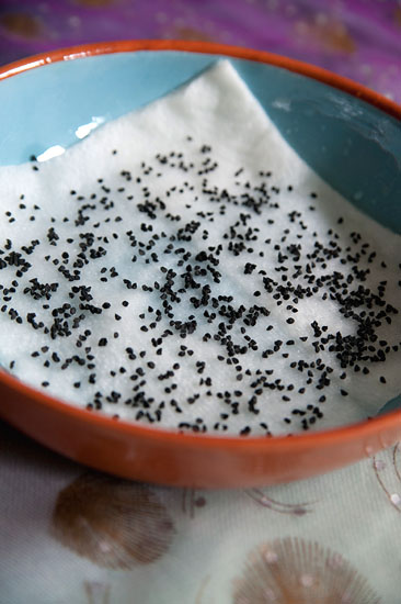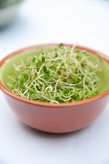 Zaden die je dagelijks moet spoelen met water kweek je anders, maar niet ingewikkelder. Zorg voor een (schone!!) glazen (jam)pot, een elastiekje en een stukje gaasdoek of tule. Strooi onderin de pot een laagje zaden van ongeveer 0,5cm dik. Giet er kraanwater bij en laat de zaden even een uurtje weken. Doe dan het gaasdoek over de pot, elastiekje erover en giet het water goed af. Laat de pot nu staan. Sommige soorten kiemen in het licht, andere dien je donker te zetten. Volg hierbij de zaaiaanwijzing op de verpakking. Spoel de zaden vervolgens één à twee keer per dag goed om en laat ze heel goed uitlekken. Zodra de zaden kiemen schud je de kiemen een paar keer om, zodat er steeds genoeg zuurstof bij kan. Om te oogsten, neem je gewoon wat kiemen uit de pot. Je kunt ze een paar dagen bewaren in de koelkast. Bij voorkeur wel blijven spoelen. Deze methode is geschikt voor oa. kikkererwt, adzukiboon, taugé, biet, radijs en alfalfa.