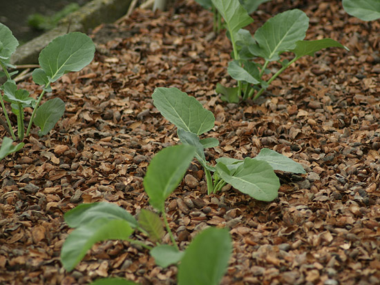 Zodra de grond opgewarmd is en zaailingen opgekomen of uitgeplant, is het tijd om de grond rondom de planten met een laag organisch materiaal te bedekken. Dat scheelt een enorme hoeveelheid werk later: wieden, want er zal bijna geen onkruid groeien, en water geven, want de mulchlaag beschermt de grond tegen uitdrogen. Om effectief te zijn moet het gebruikte materiaal natuurlijk vrij zijn van onkruidzaden en dit geldt helaas meestal niet voor zelfgemaakte compost en stalmest. GFT-compost scoort veel beter en champost is helemaal vrij van onkruidzaad.
