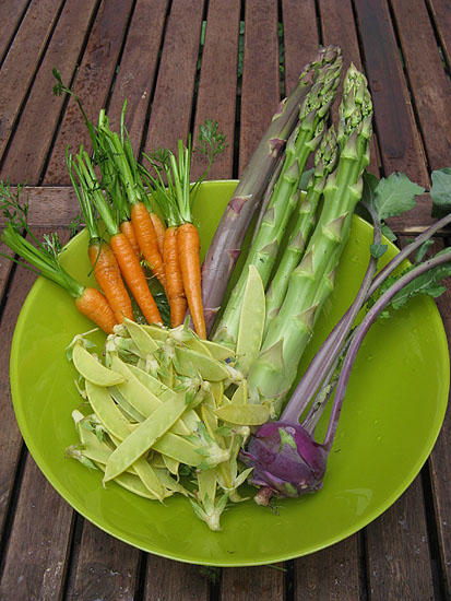 Na de laatste oogst van snijgroen (mizuna, mibuna, raketsla) en radijsjes word het bed met een laag goedverteerde stalmest bedekt en een pompoenplant uitgezet die 3 tot 4 weken eerder binnen werd voorgezaaid
