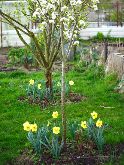 Het wordt vaak aanbevolen om narcissenbollen rondom fruitbomen te planten. Deze bollen zouden namelijk knaagdieren bij de wortels weghouden. Over hoe dit precies zou werken, verschillen de bronnen nogal. De een beweert dat de woelmuizen nog liever dan aan de wortels van de bomen aan narcissen knagen, dus je bollen gaan misschien wel verloren, maar je boom blijft ongedeerd. De ander zegt, dat de bollen toxines bevatten die knaagdieren en ook nog eens rendieren verafschuwen. Hoe dan ook: narcissen in de bloei rondom bloeiende fruitbomen zijn prachtig!