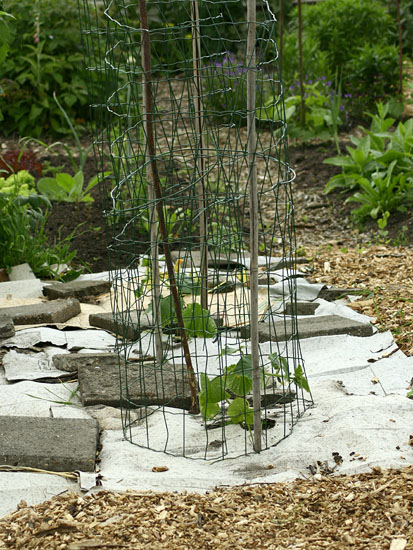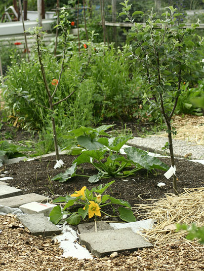 De appelbomen zullen pas over een paar jaar oogst gaan geven. We hebben gekozen voor rassen die ziekteresistent zijn, de een is een handappel en de ander een moesappel. Beide soorten zijn tot januari bewaarbaar (mits niet eerder opgegeten!)