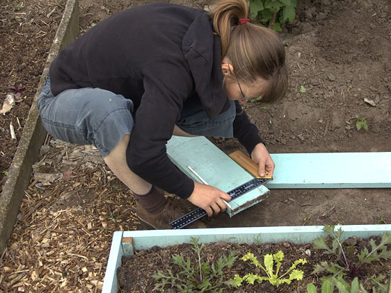 Om te voorkomen dat de planken naar buiten gaan buigen door de druk van de grond, hebben we in het midden een latje bevestigd en in de grond geslagen. Dikkere planken zouden een nog betere oplossing zijn, maar deze zijn helaas nóg duurder.