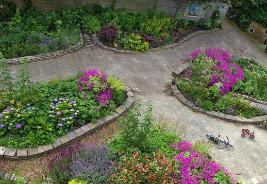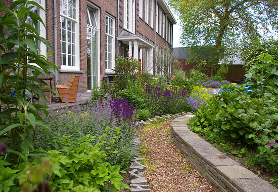 Muurtjes, heuveltjes en smalle paadjes zorgen voor reliëf en afwisseling in de tuin. De tegels hebben we gebruikt om muurtjes te bouwen waar je op kunt zitten, maar ook als randen van een border. Zo zijn er in de tuin verschillende plekken en paadjes te vinden tussen de eilanden met planten. Natuurlijk zijn er ook allemaal speelplekken voor de kinderen. De grote tafel, gemaakt van de oude schoolkapstokken, wordt vooral in de zomer veel gebruikt.