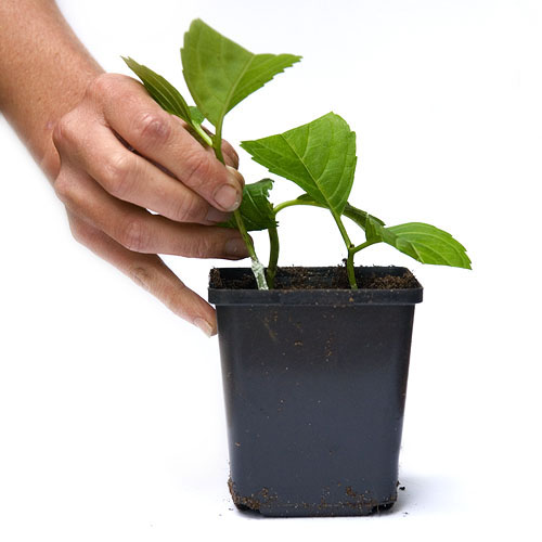 Verwijder de top (om eerst wortelgroei te stimuleren in plaats van bladgroei). Bij stekken met grote bladeren snijd je het overgebleven bladpaar doormidden om vochtverlies zoveel mogelijk tegen te gaan. De stekken hebben net genoeg blad nodig om te blijven leven.