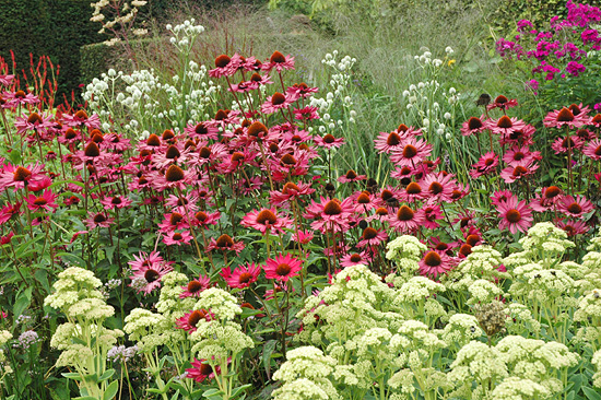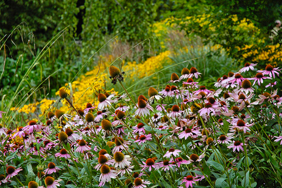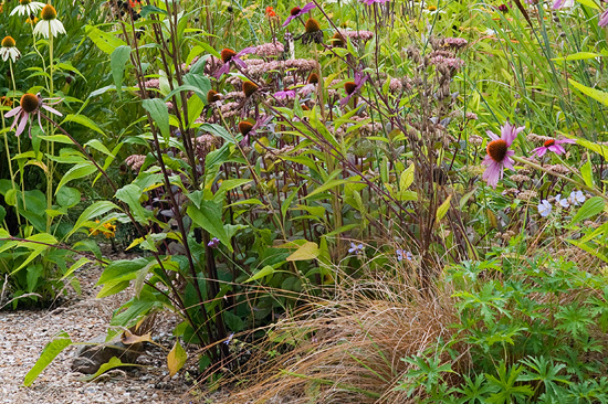 Prairiebeplantingen zijn in ons land per definitie uitheems. Het heeft dus geen enkel ecologisch nut om te proberen een ‘pure’ prairiebeplanting te realiseren. Doe gewoon wat je mooi vindt.