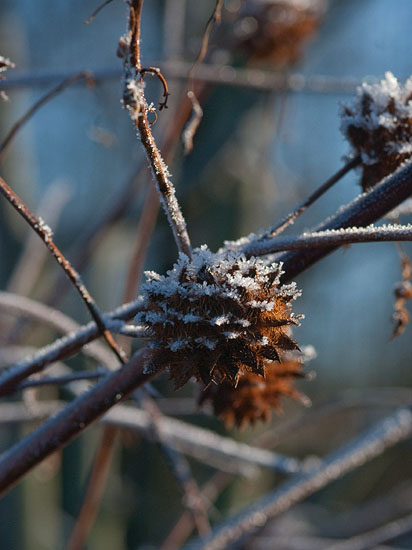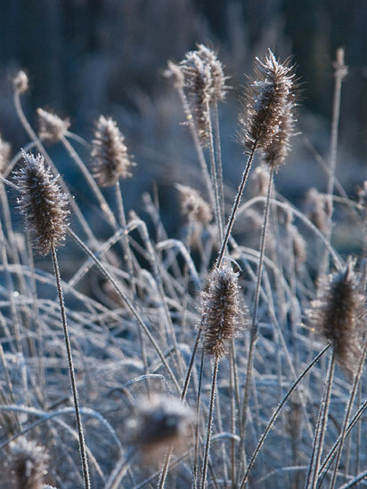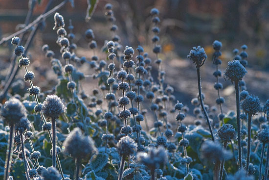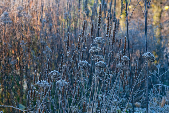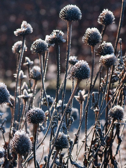 Donkerbruin worden de zaadhoofden van onder andere echinops, verbena, phlomis, monarda, sedum, veronicastrum en Dipsacus fullonum.